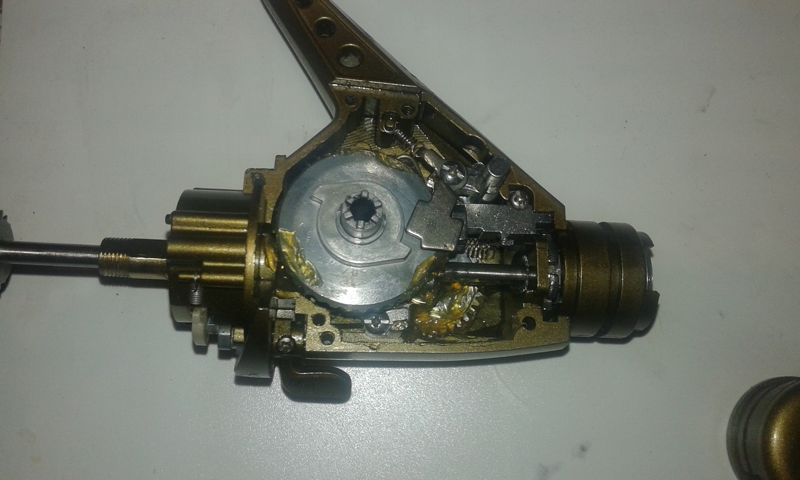 Разглобих и другите три братчета..... байтрънърчета Томакс БЛУ ФОРС 350. Първи проблем, с голям, ама голям зор развих болтчетата на лоста на втория аванс, бяха явно с капка лепило по резбата! Но пък за това бяха с грес по зъбчатките и на лагерите на манивелата. Огледах, добавих още малко масълце и грес и затворих.