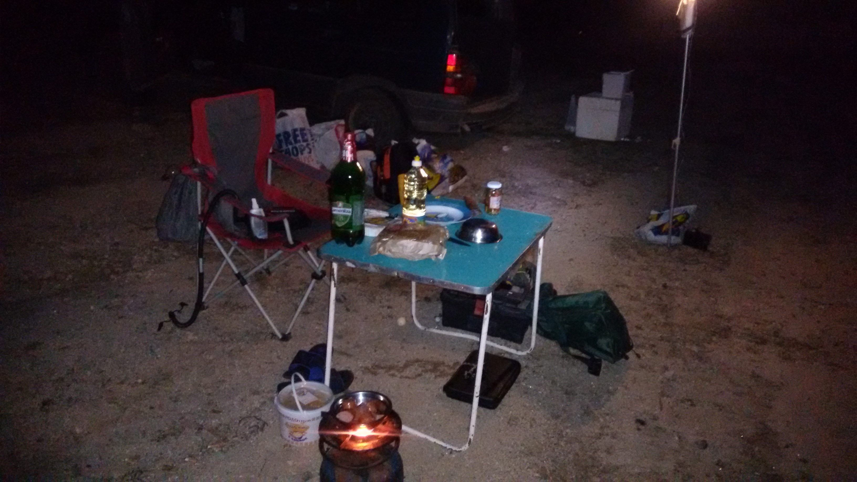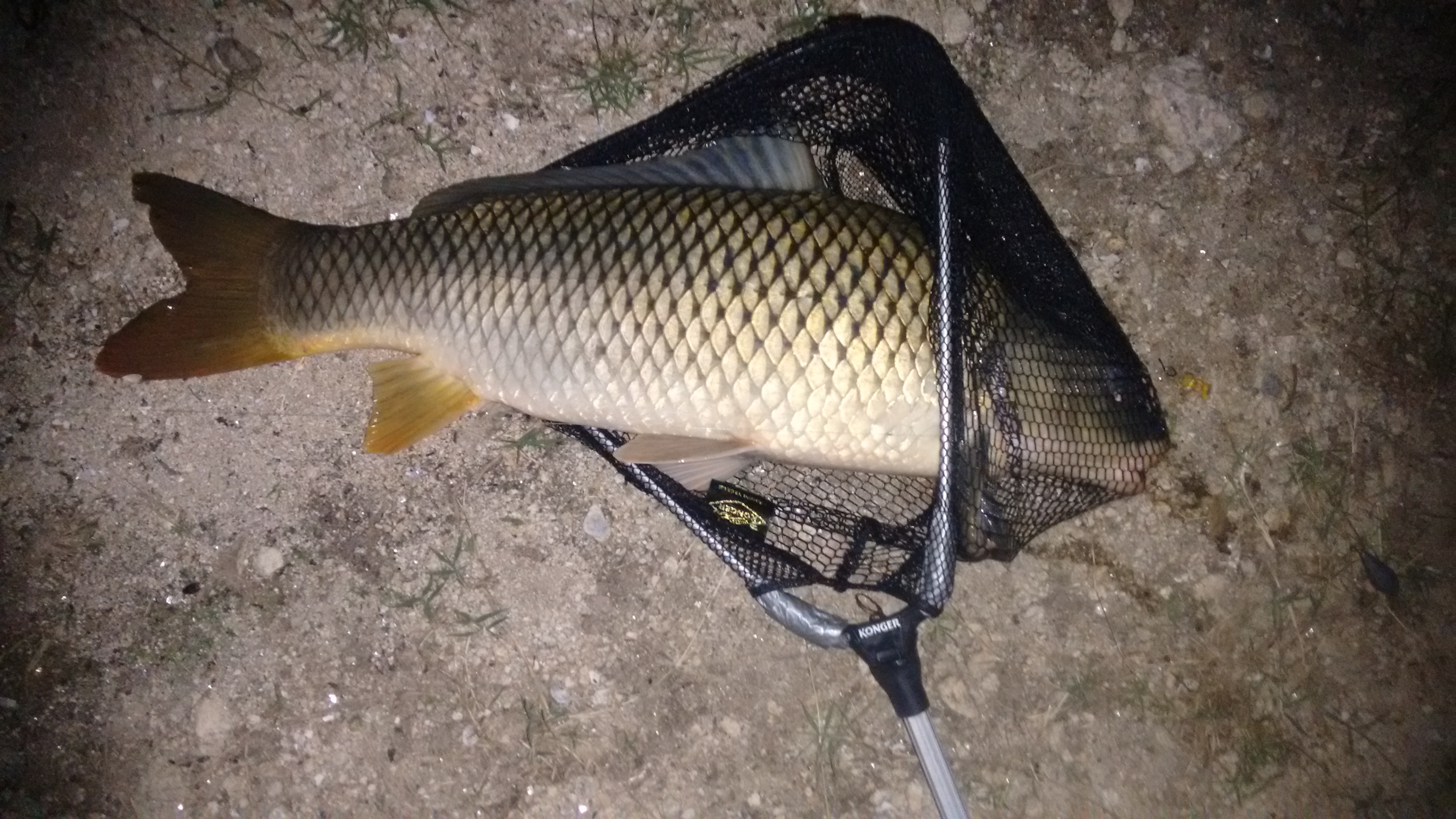 Тук таме колегите вадеха по някоя риба подобен бичим. В края на деня все още в светлата част тъкмо подготвях вечерната трапеза сигнализатора изсписука ,няма рън а влакното трепери един пръст нагоре,един надолу. Викам там е-засечка и навиване . Да ама тук още навътре тая риба почва да натиска. Докарах я до брега ,видя се,че не е от стандартния 1.5 кг. Аз сам,но проблемът е ,че поради суеверие не нося големия кеп и два пъти я вкарвах в малкия и излиза. Как да е каталяса накрая та го гушнах и навън