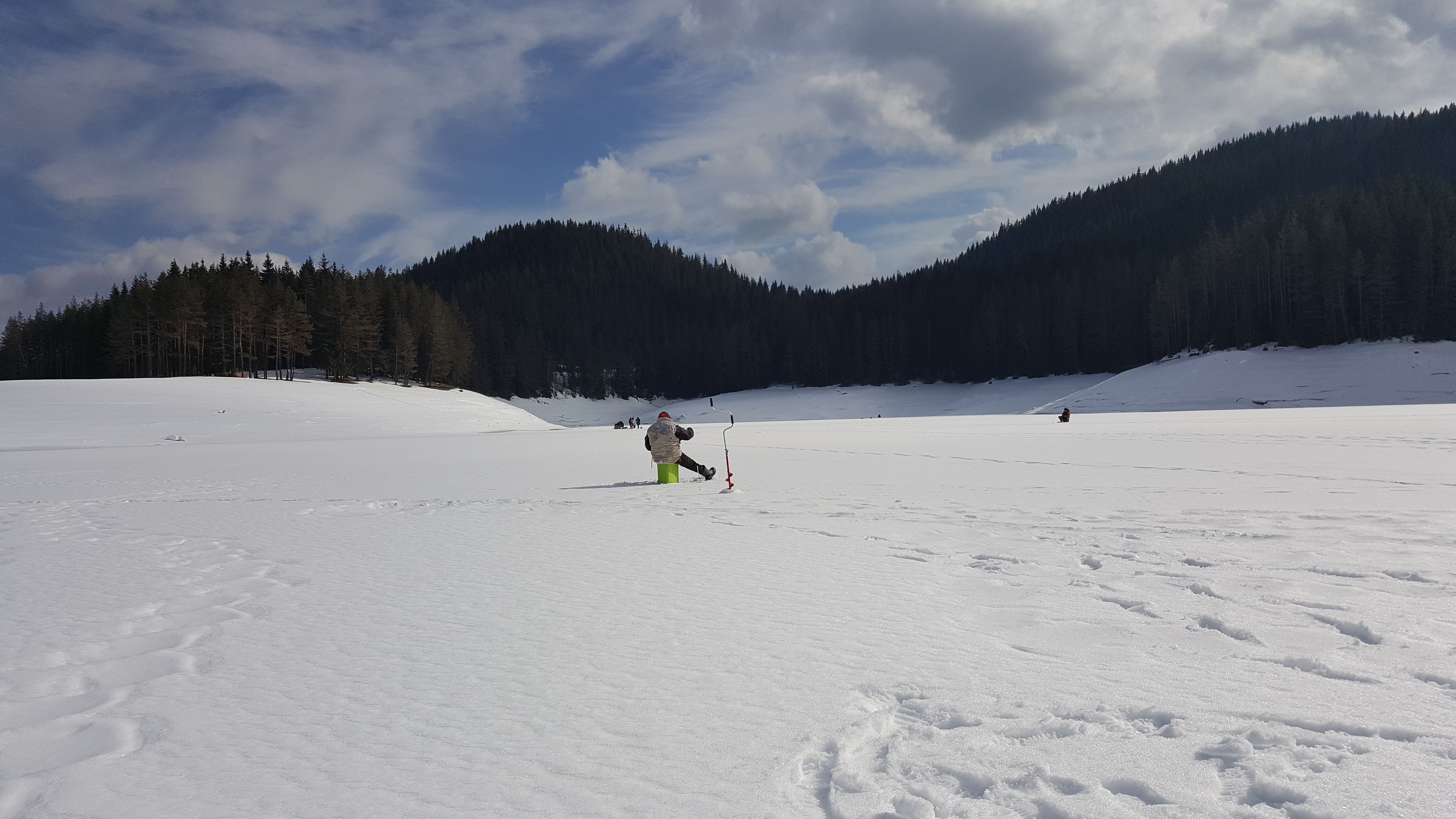 В момента съм на Батак.Като гледам времето май ще закривам тук.Ледът е над 20см. все още здрав , но опече ли слънцето пука и бучи здраво.Хора има много и рибари и такива който просто се разхождат по леда.Няма много движение и дупчене,защото се хранят една две дупки и се чака рибата да се завърти.Като гледам няма друг като мен с над 30 дупки ,но е разбираемо защото съм само с блесната .Рибата не е много активна но мога да се похваля ,че спасих капото с пет Баташки кустура педарки.
