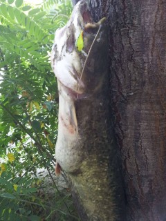 Майстор Къци позна ли си воблера? Сомчето е 5.5 кг... 92 см. Воблера беше в гърлото на сома, но го откачих с кохера и го снимах така, за да се види по добре. Даже воблерчето ( 4 см) си беше с твоите куки и халки, но издържаха битката. Ловях кефали, та покрай тях ме изненада този с мустаците...