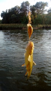 Значи, онази неделя си вървях бавно по брега на язовир Доспат откъм плитката му страна, нищо не ми кълвеше, и изведнъж намерих един изхвърлен от вълните жълтичък "къца-кълве", явно скъсан от колега при тролинг... Сложих го, заметнах, и, о, Чудо! Един корморан се совна ненадейно от небето, и го отнесе, преди още да го приводня. Изводът: "къца-кълве" наистина лови всичко! Ще си поръчам няколко, да ги пробвам и върху сивите чапли, на Доспат много ги има, но трудно кълват!