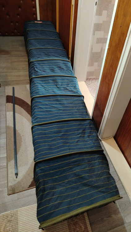 Много запазен плосък живарник Trabucco. Размери - 350/50/40 см. Подходящ за река и язовир. Оборудван с ръчно направен стоманен кол с дължина 125 см, прахово боядисан.