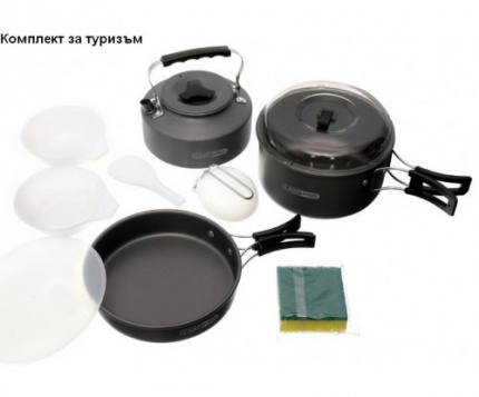 Предлага ме Ви новият туристически комплект за пикник, съдържащ две пластмасови купички, една лъжица за готвене, малка кухненска гъба, един тиган (алуминиев), един чайник с капак за чай и кафе, една тенджера с капак и черпак за супа. Всичко е събрано в луксозен, водонепропусклив твърд калъф с дръжка за носене. Дъното е от пресован неопрен за поставене на всякакви терени. Уникален комплект за вашите страхотни риболовни и ловни излети. Топ подарък за всеки!